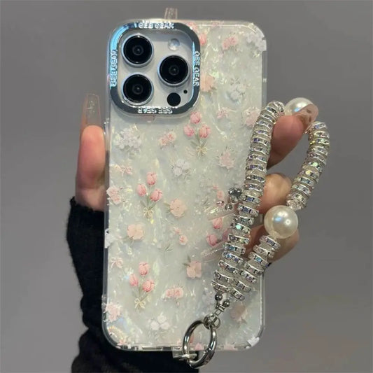 Elegant Floral Pearl iPhone Case – Delicate Design with Beaded Chain