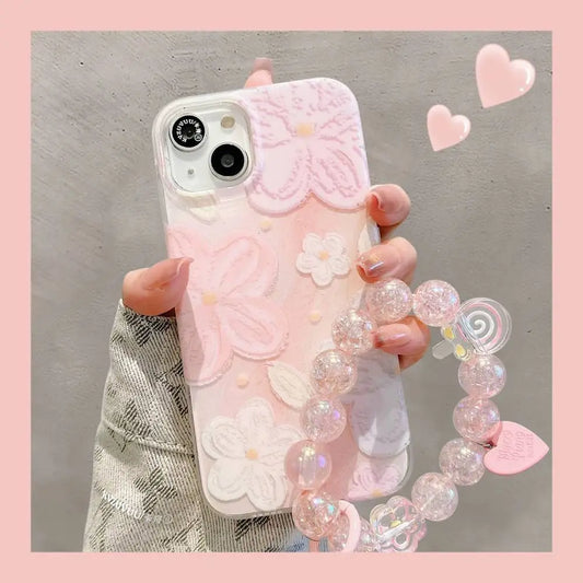 Pink Floral Glitter iPhone Case with Beaded Chain – Elegant & Protective